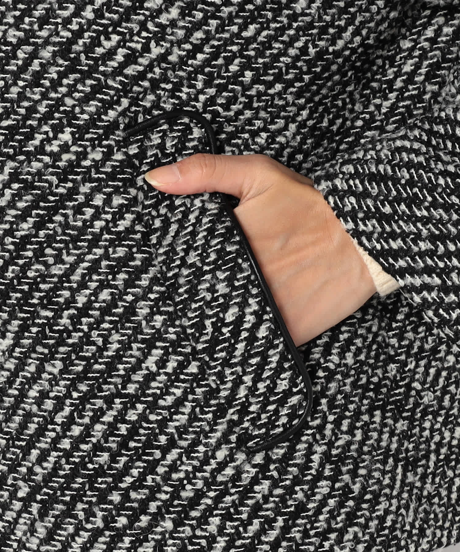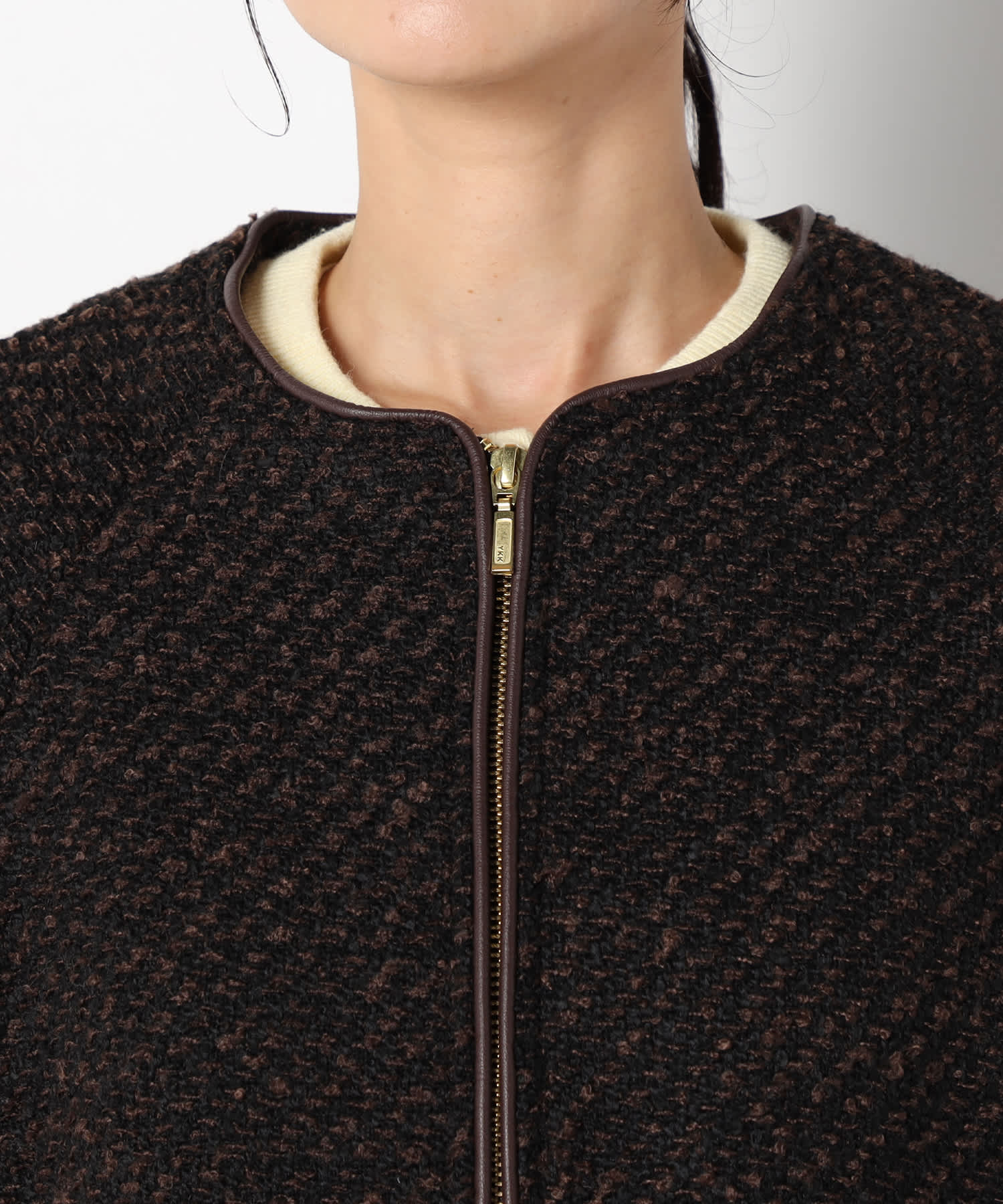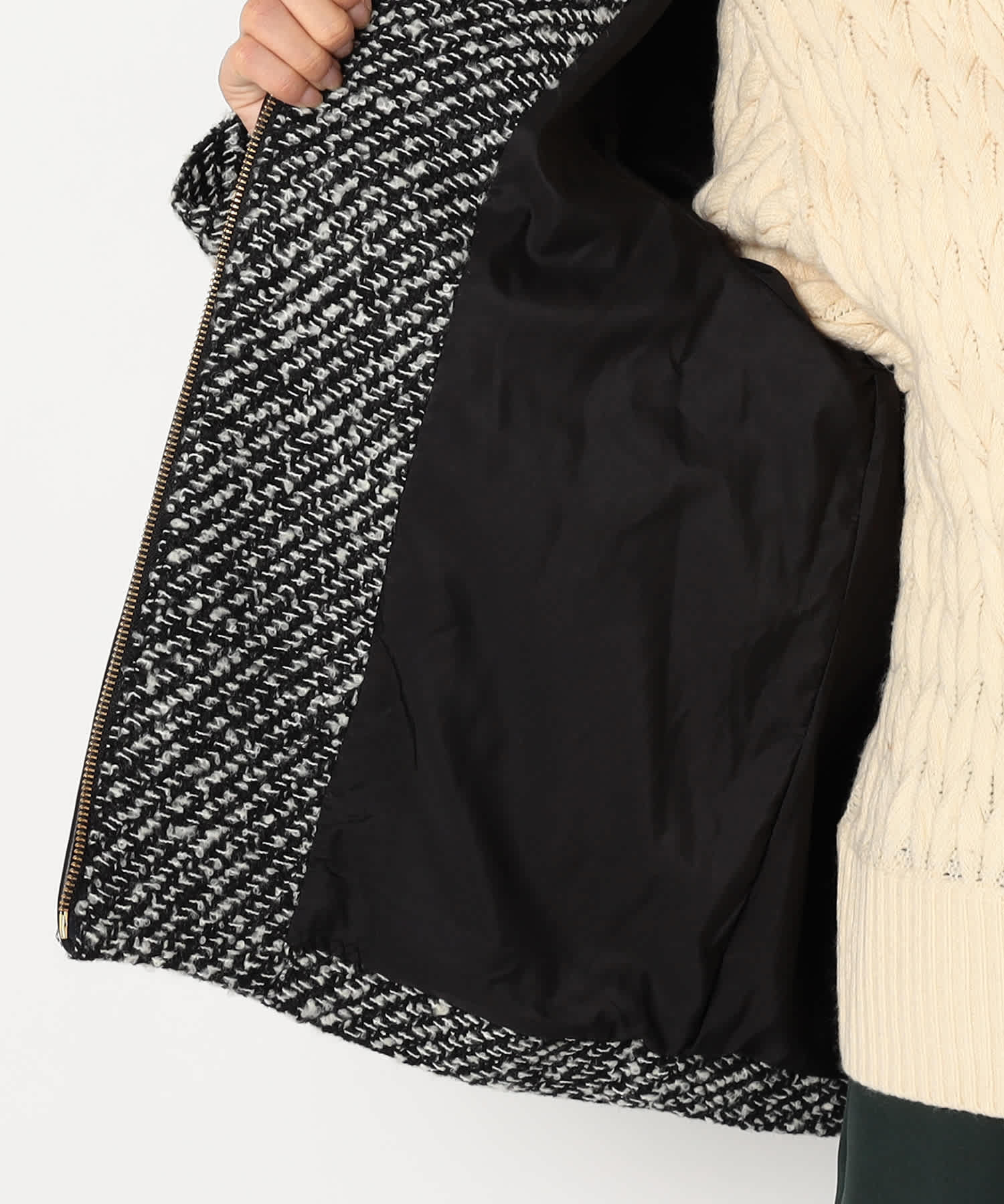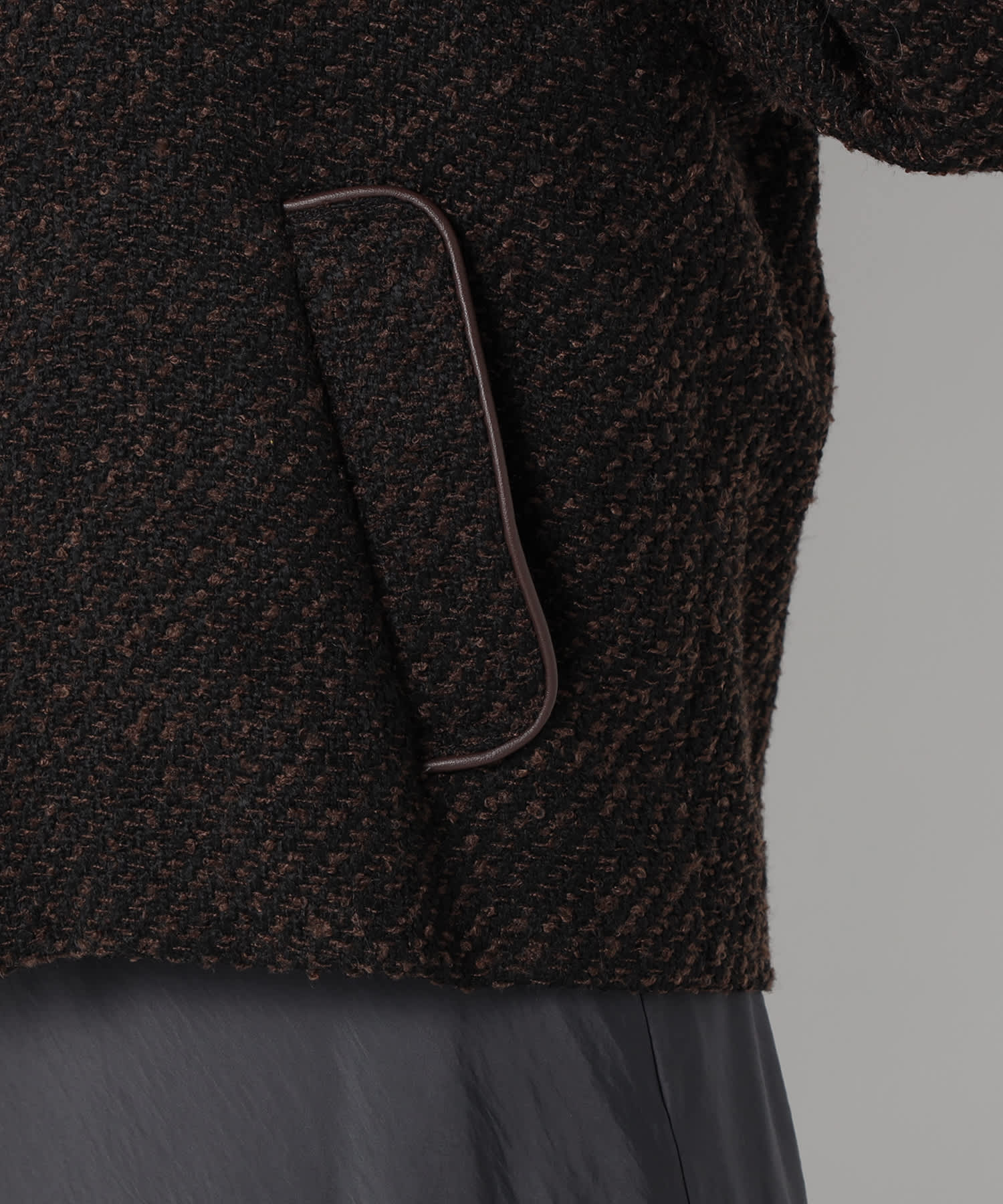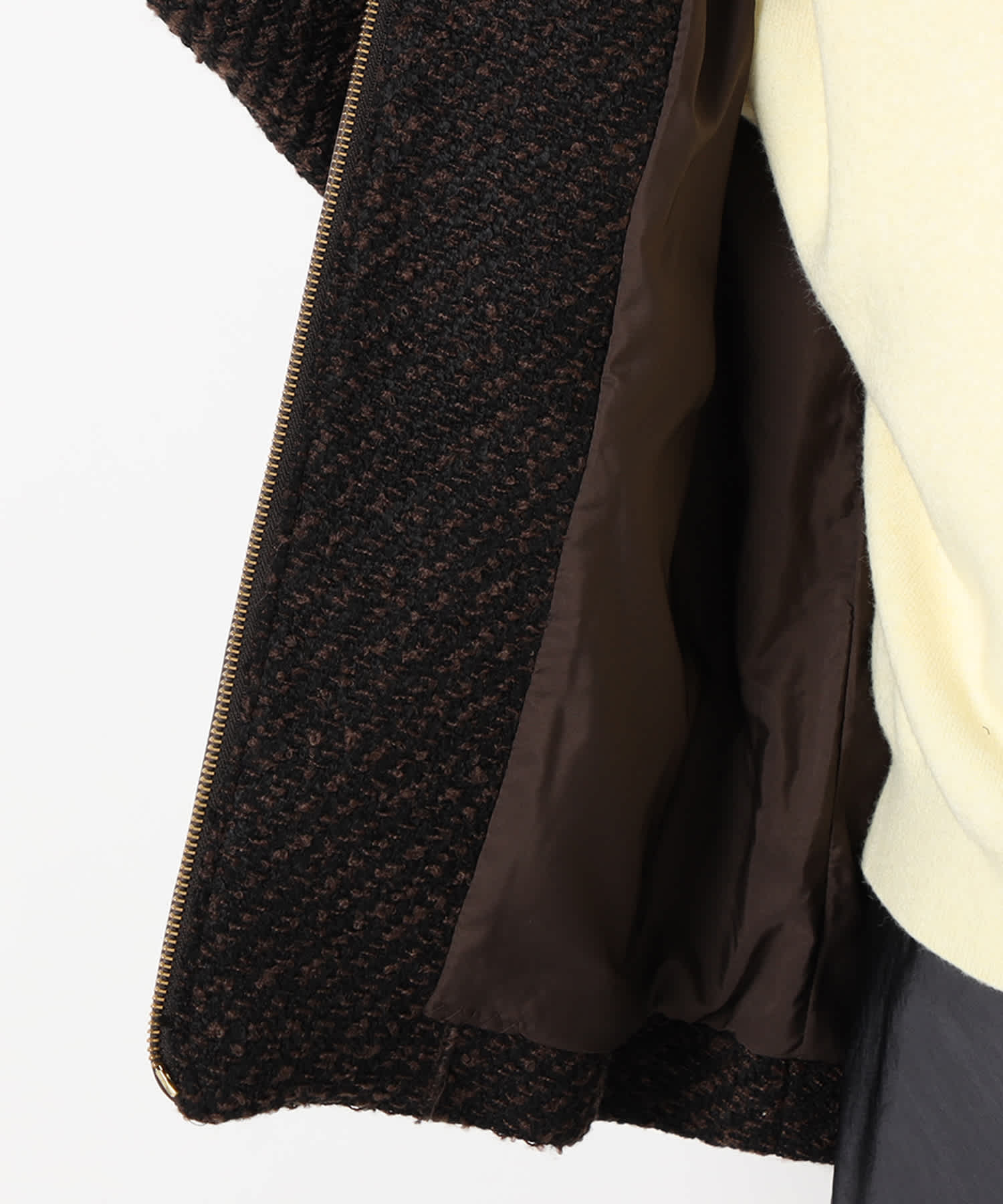 モノトーンのツイード素材が特徴の上品なアウターです。