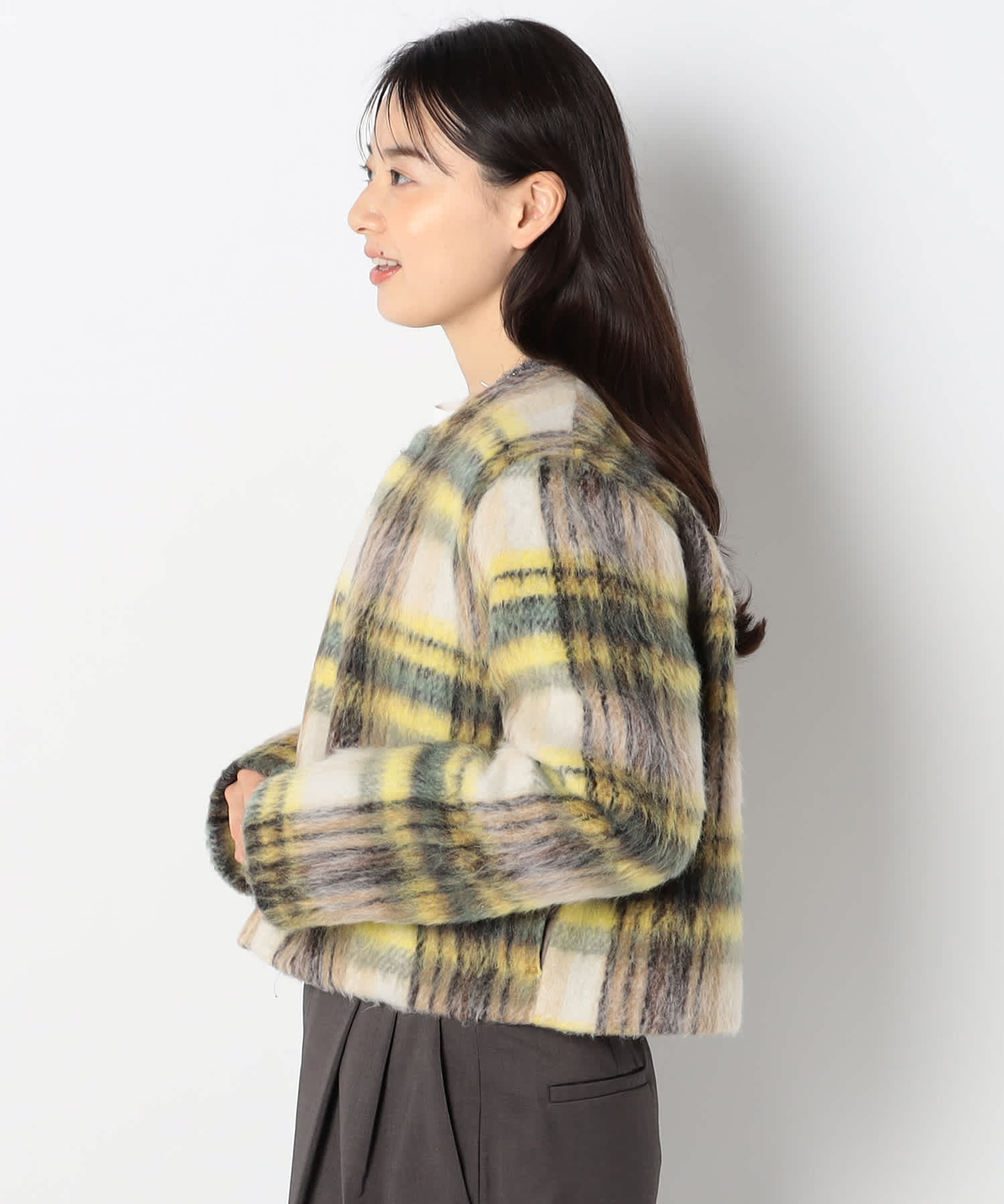 チェック柄が目を引くスタイリッシュなアウターです。