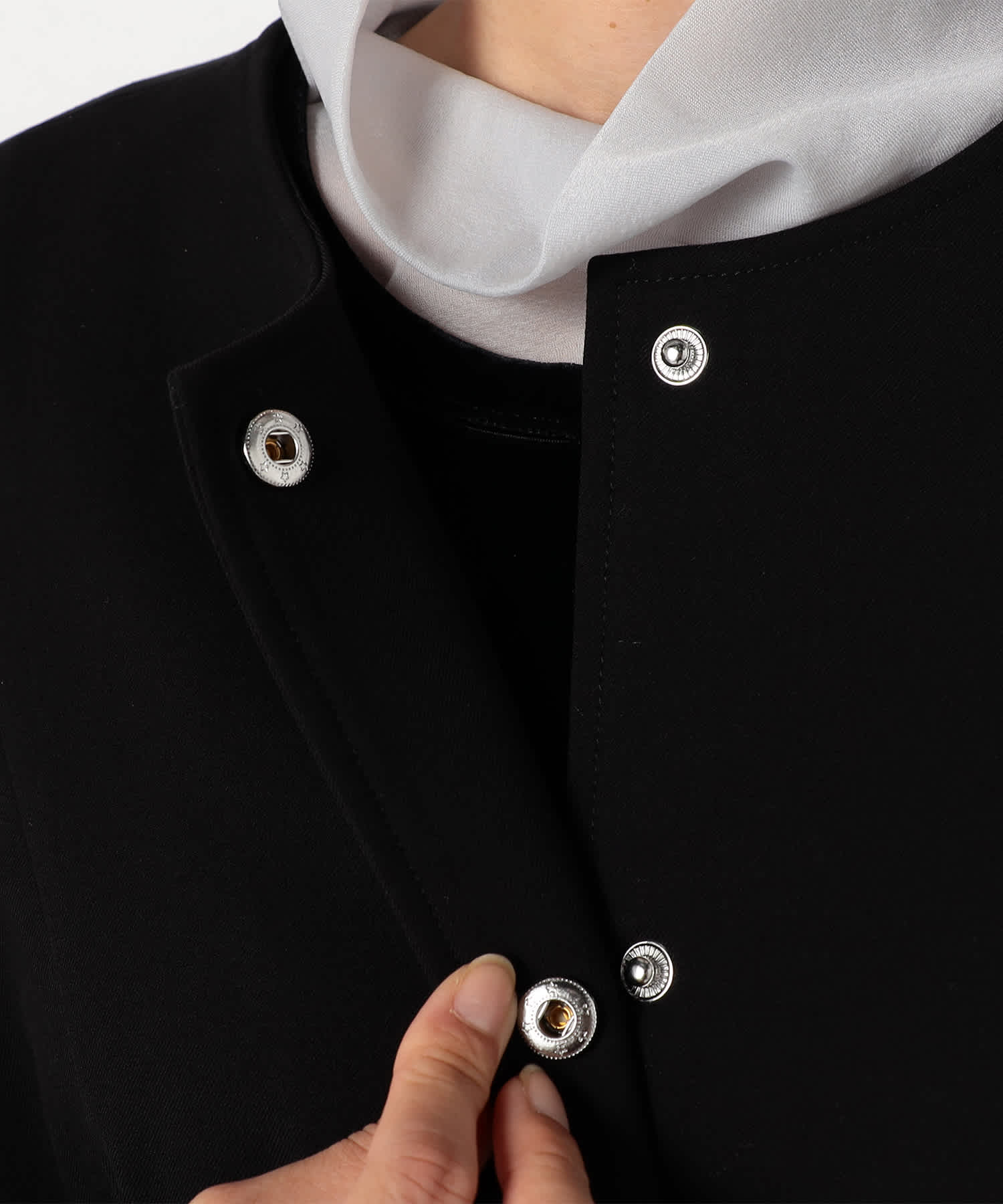 スナップボタンがアクセントとなり、カジュアルながらも洗練されたムードを演出します。
