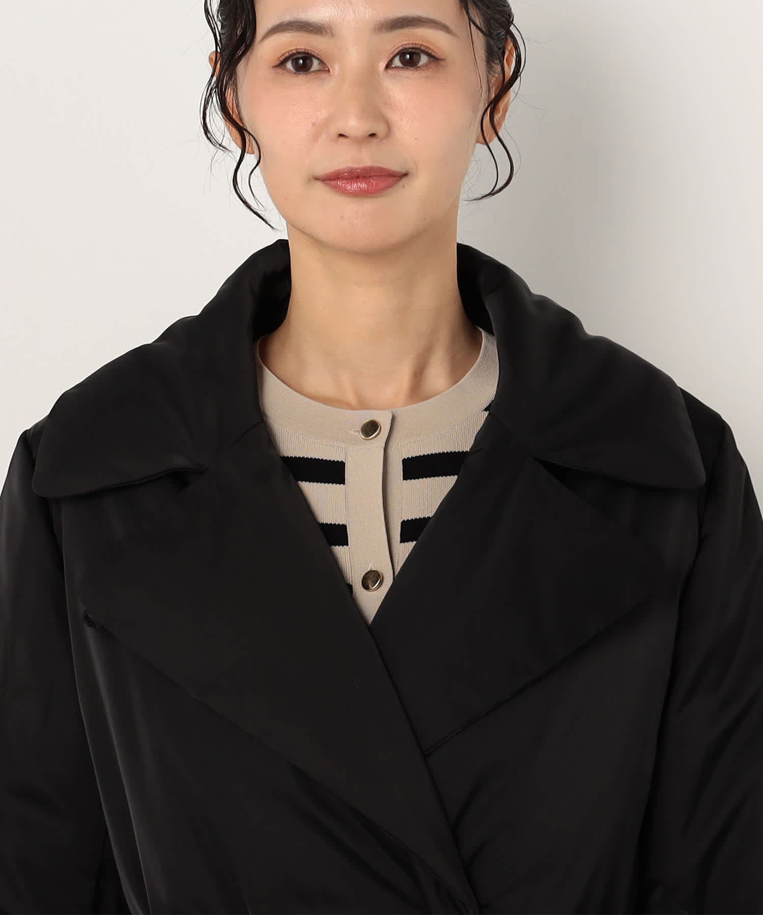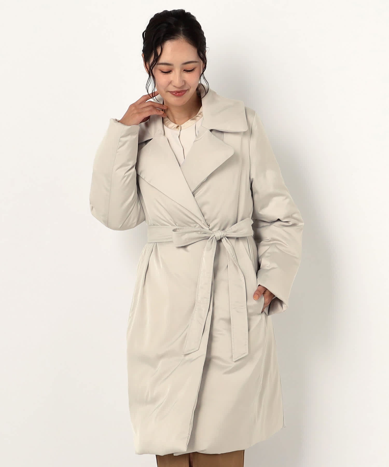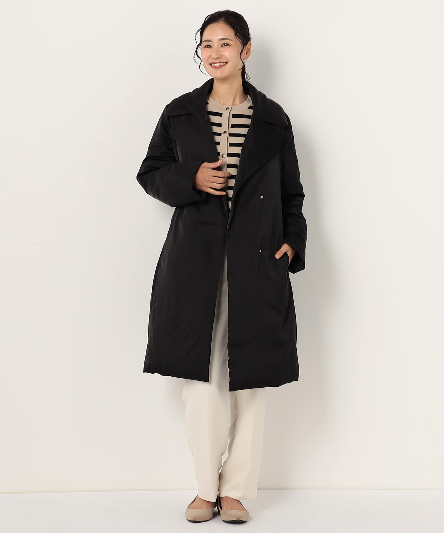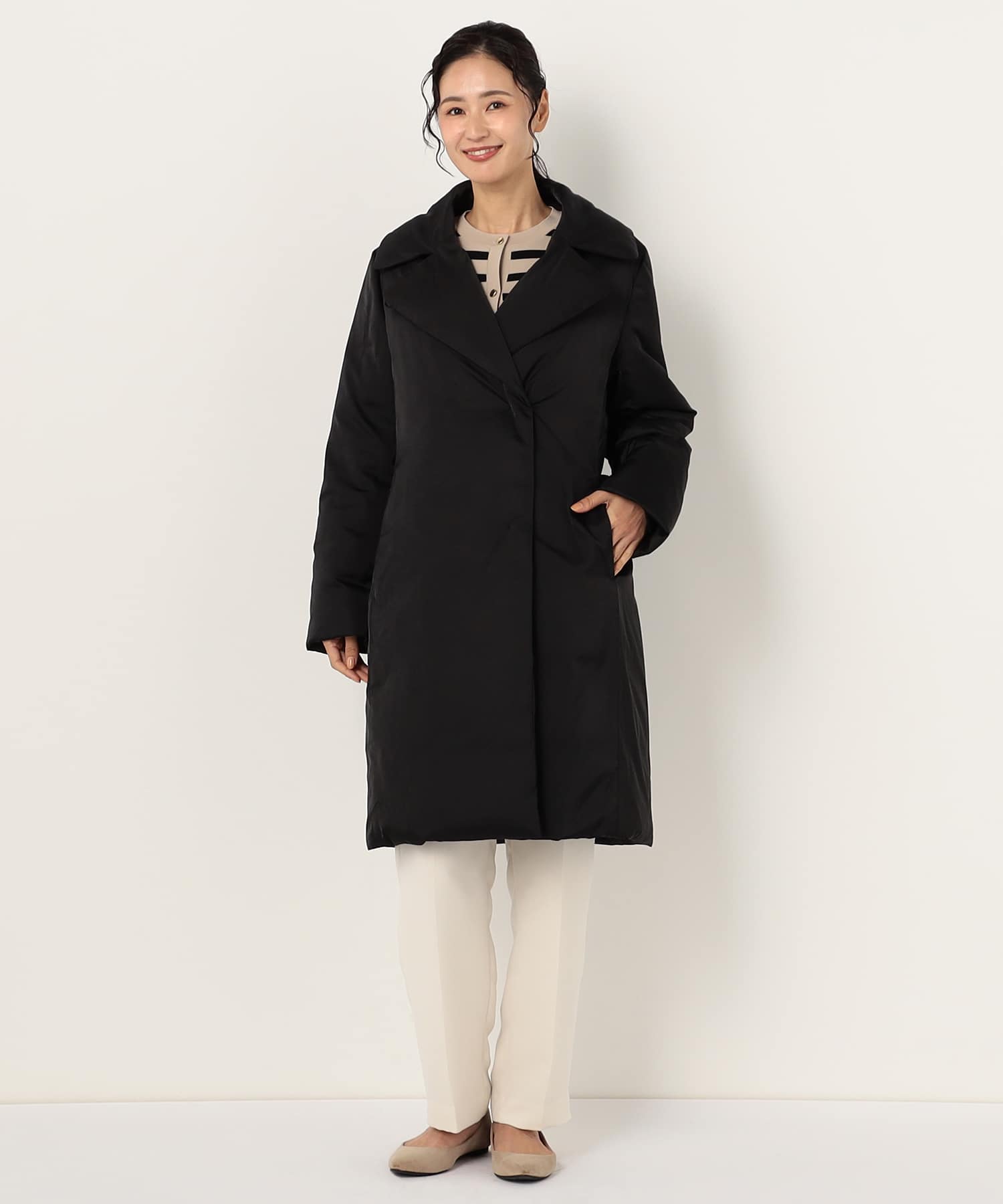 エレガントなデザインが魅力のロングコートです。