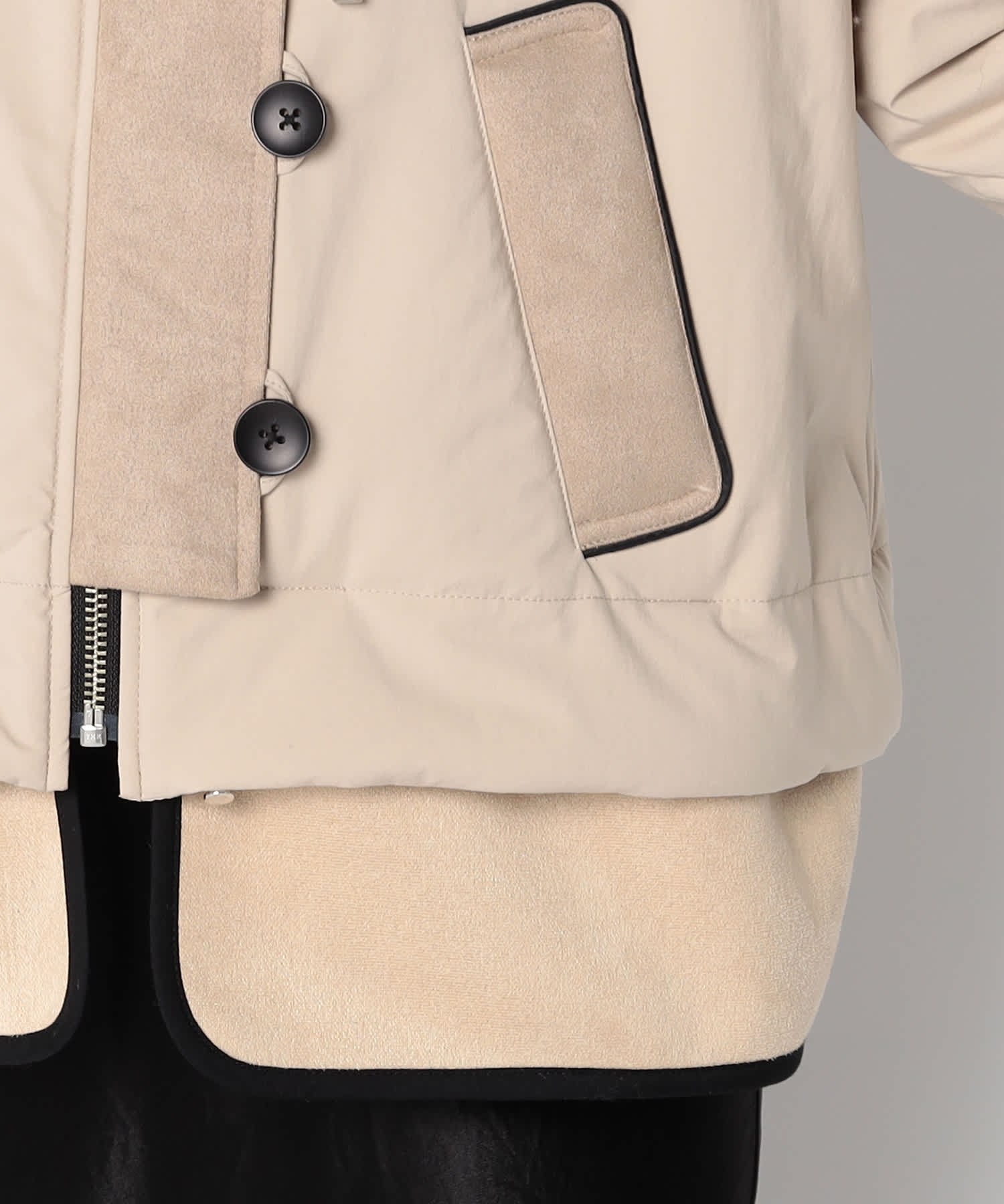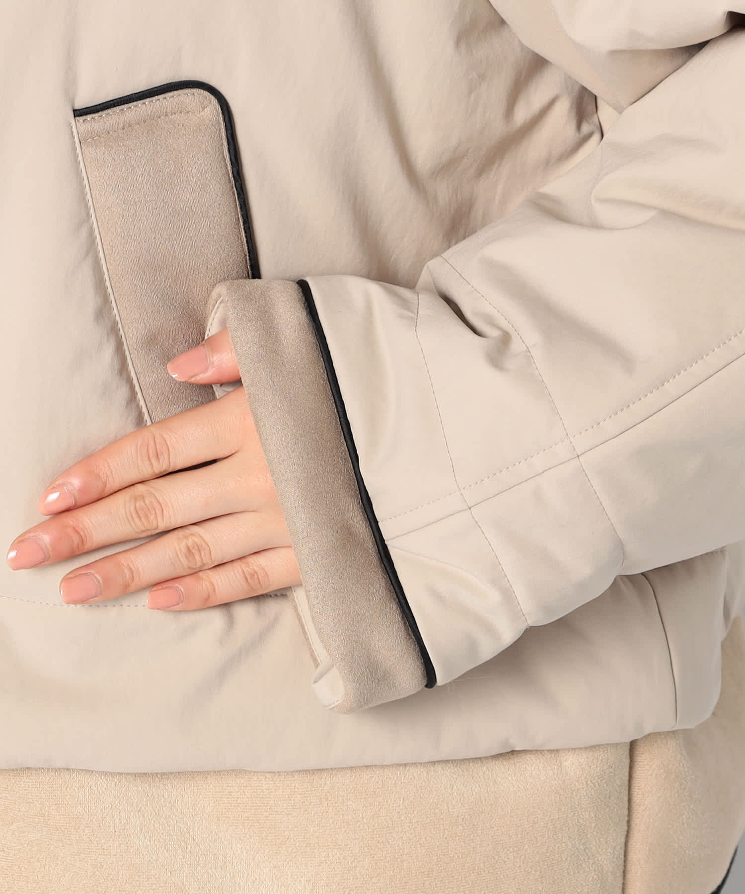 袖口や裾のパイピングが全体を引き締め、上品な印象を与えます。