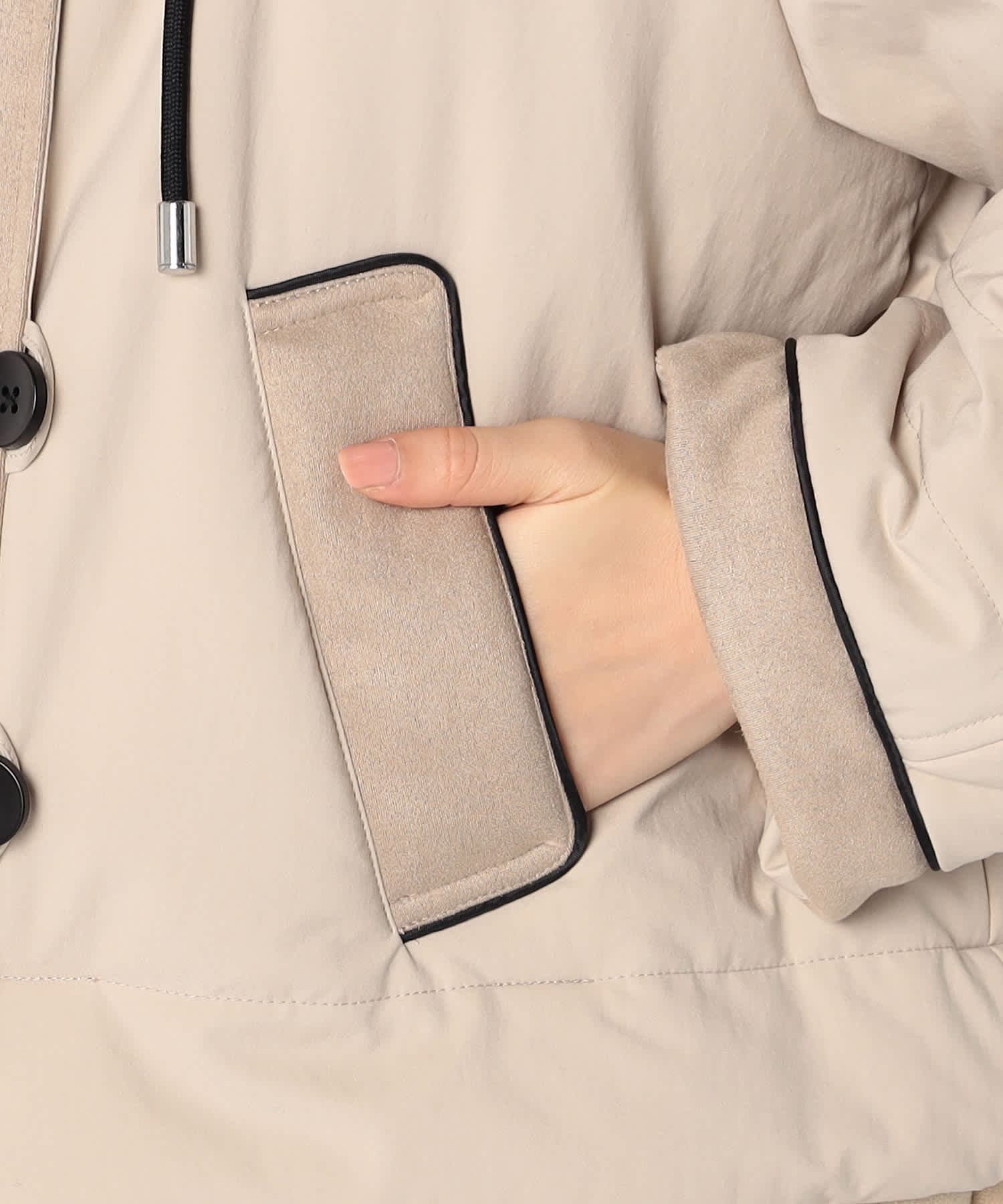 厚みのあるファーが施されたフードが特徴で、暖かさとスタイリッシュさを兼ね備えています。