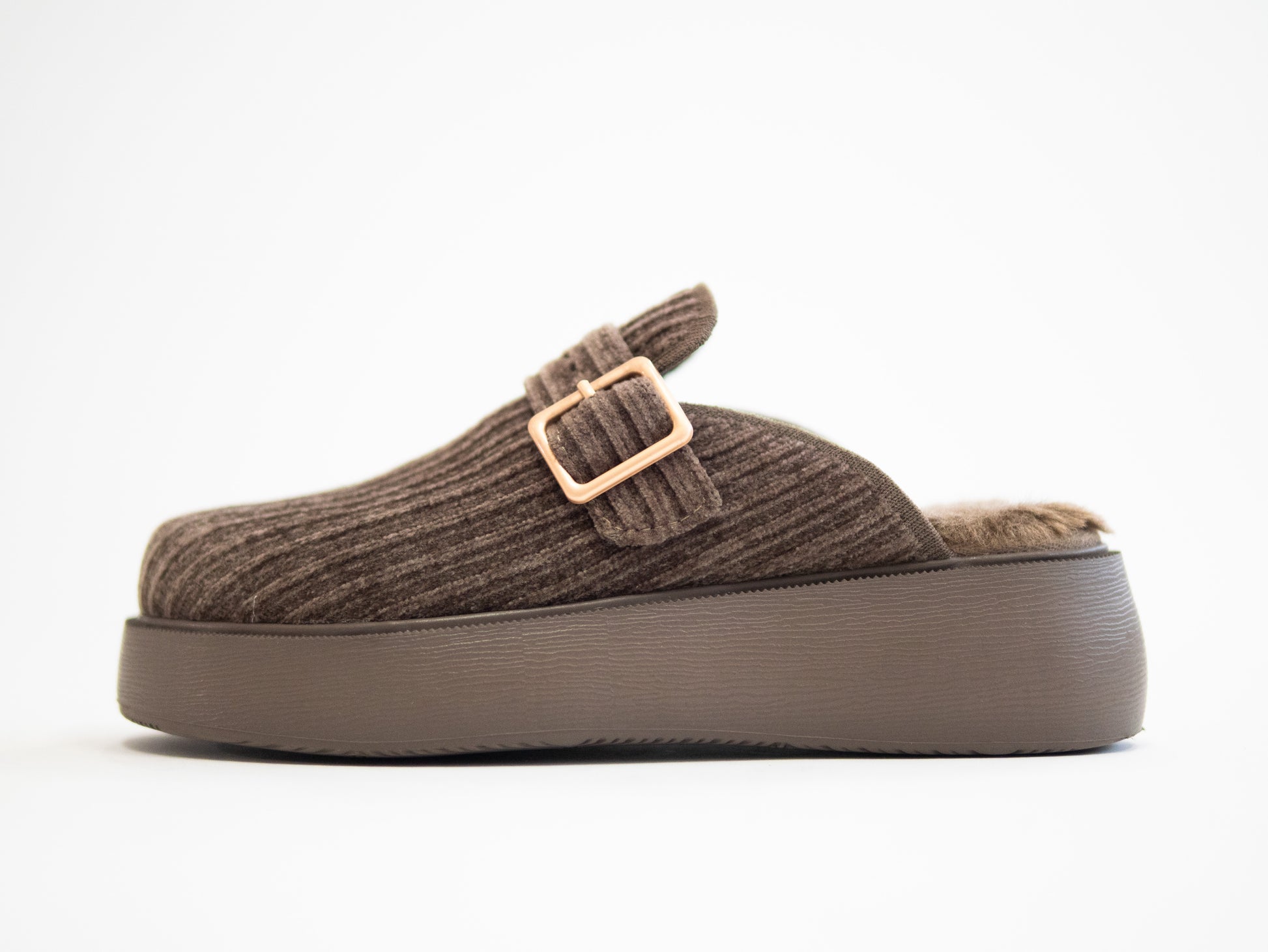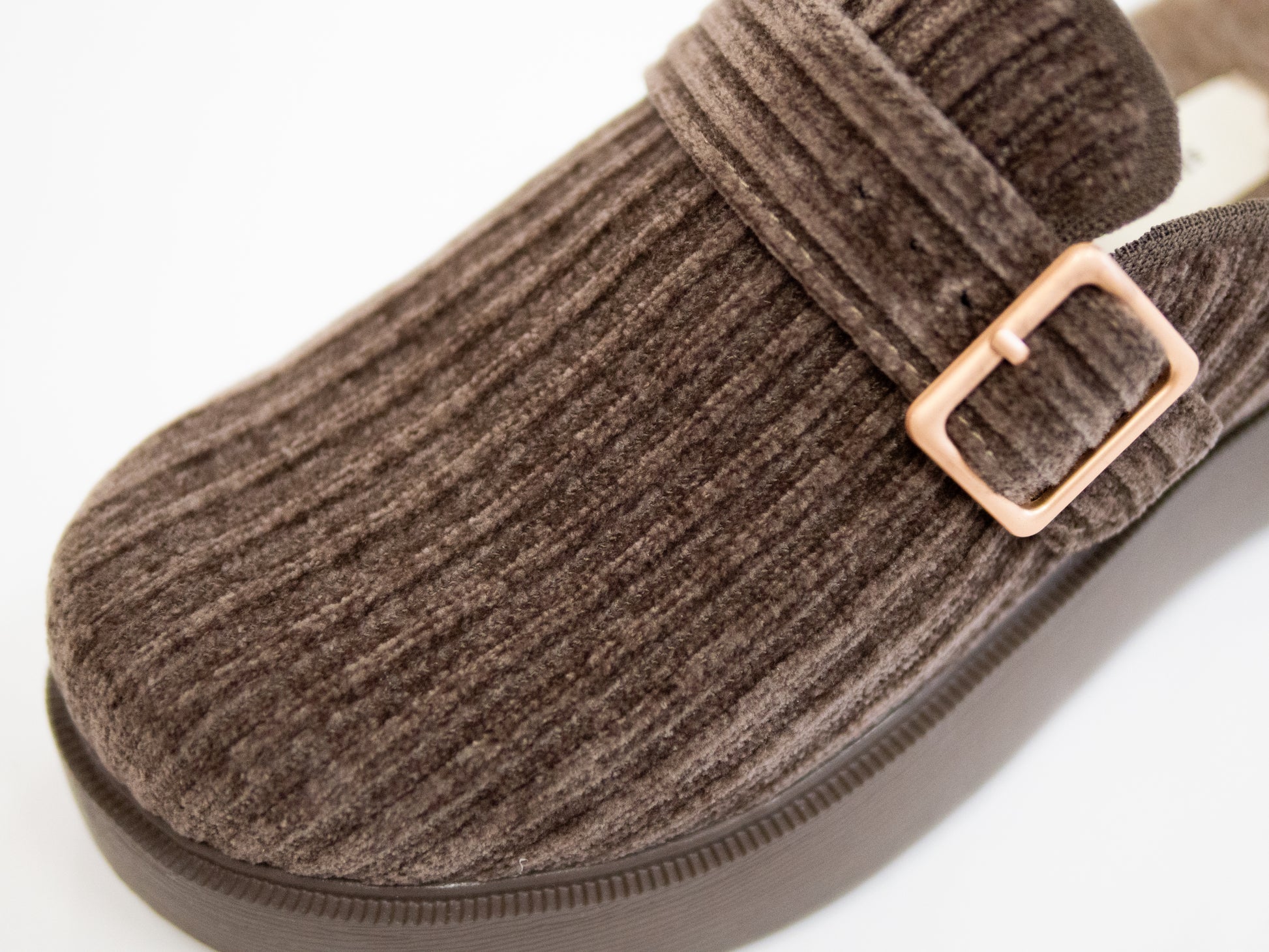 毛羽立ちのあるシェニール糸で編み立てており、あたたかみのある厚底クロッグシューズ。